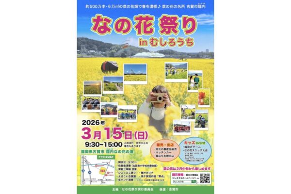 2026年3月15日に開催される第25回では、約500万本の菜の花が咲き誇り、会場一帯が鮮やかな黄色の絨毯に包まれます。ステージイベントや地元グルメ、抽選プレゼントなども楽しめる、福岡の春を代表する地域イベントです。