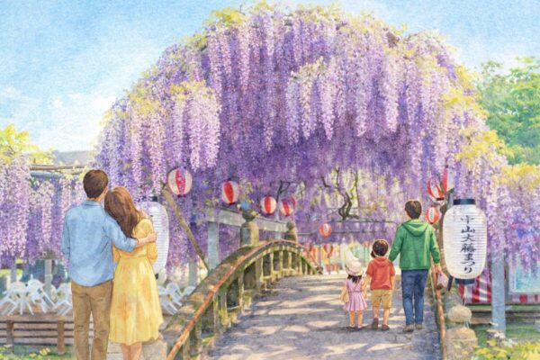 約350坪に広がる藤棚からは、満開時には長さ1メートルを超える花房が垂れ下がり、神社の石橋を覆うように咲き誇ります。紫色の花が織りなす「藤のカーテン」は幻想的で、会場全体がやさしい香りに包まれます。