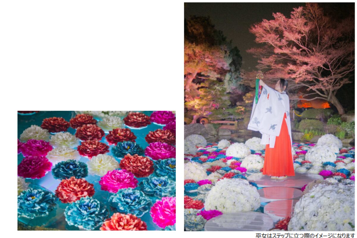 色鮮やかな花が水面に浮かぶ幻想的な風景と、夜の光が織りなす幽玄な演出。『浮花』は、時間帯によってまったく異なる表情を見せる唯一無二の体験型アートです。