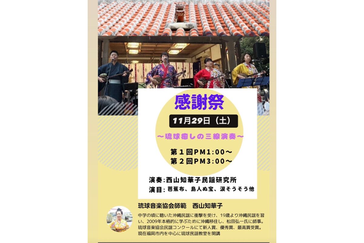 演奏を担当するのは、沖縄民謡研究所「まじゅん」を主宰し、琉球音楽協会師範でもある西山知華子さん。2009年より本格的に沖縄民謡を学び、数々の受賞歴を持つ実力派です。披露される曲目は「芭蕉布」「島人ぬ宝」「涙そうそう」など、耳なじみのある人気曲ばかり。