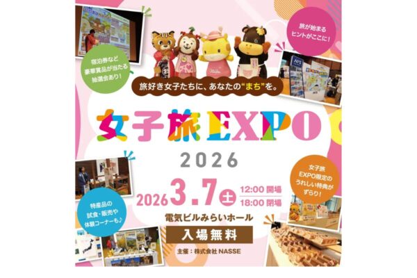 旅好き女子に向けた観光PRイベント「女子旅EXPO2026」が、2026年3月7日(土)に福岡市中央区の電気ビルみらいホールで開催されます。全国の観光地や自治体が集結し、体験型コンテンツや豪華抽選会が楽しめる無料イベントです。事前予約制・先着1,000名限定での開催となります。