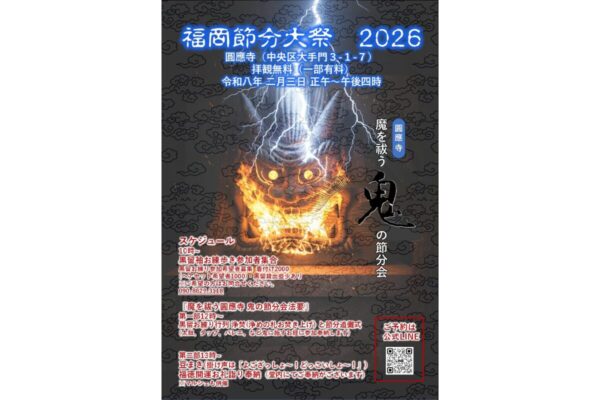 2026年2月3日、福岡市中央区の古刹・圓應寺で、法要と芸能ライブ、独自の豆まきが融合した節分行事「福岡節分大祭 -魔を祓う- 鬼の節分会」が開催されます。伝統と現代芸術が交錯する、他にはない体験型の節分イベントです。