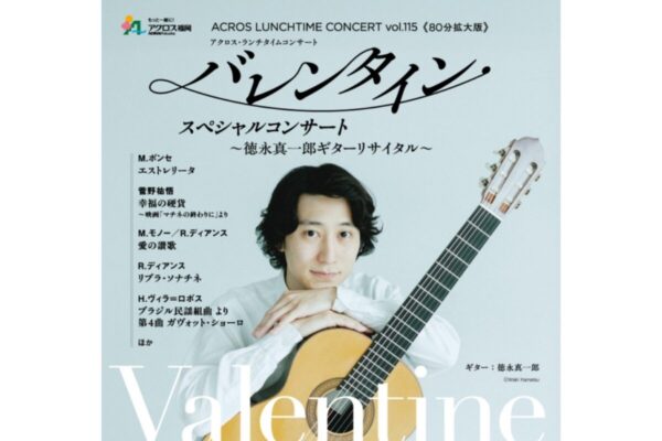 ランチタイムに楽しめる人気の音楽イベント「アクロス・ランチタイムコンサート」が、バレンタイン・スペシャルとして特別開催されます。今回は“愛”をテーマに、ギターの名手・徳永真一郎さんが奏でる珠玉の名曲を80分拡大版でお届け。着物来場者への特典や協力店サービスも要チェックです。