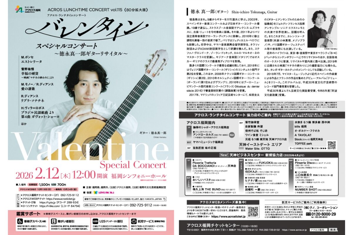 毎回好評の「アクロス・ランチタイムコンサート」。2026年2月12日(木)は、“バレンタイン・スペシャルコンサート”として徳永真一郎さんのコンサートが開催されます。今回は通常より長い80分拡大版で、愛をテーマにした名曲の数々が披露されます。