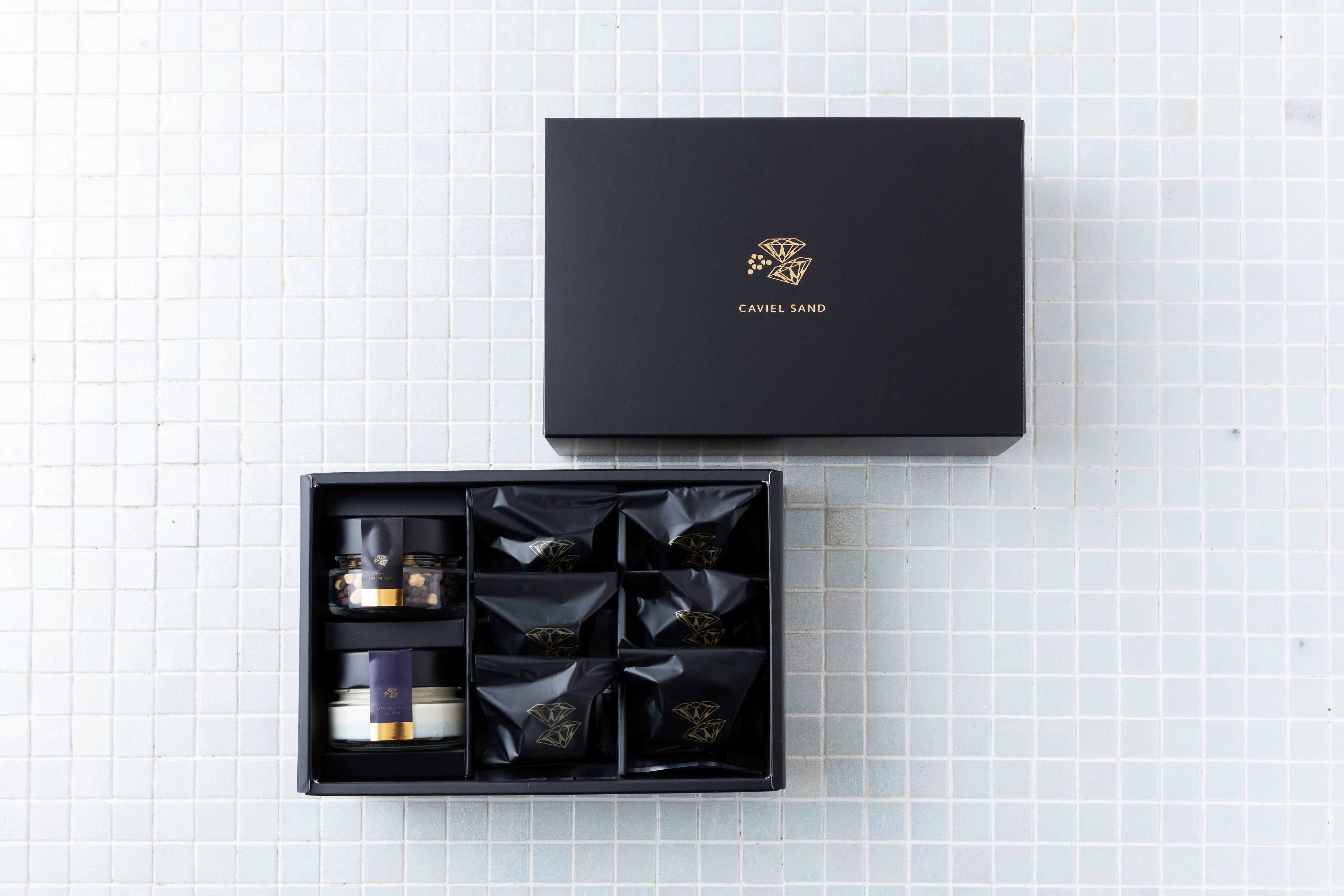 キャビア塩の風味を最大限活かしたビターとキャラメル味のパールチョコレートと、海をイメージした二層のマスカルポーネクリームをダイヤモンド型クッキーで包み込んだ新感覚のプレスサンド。
