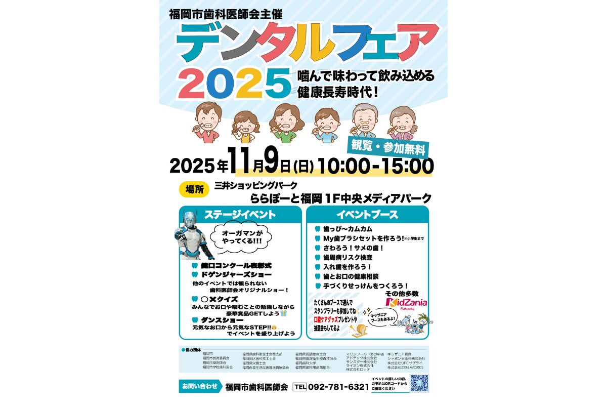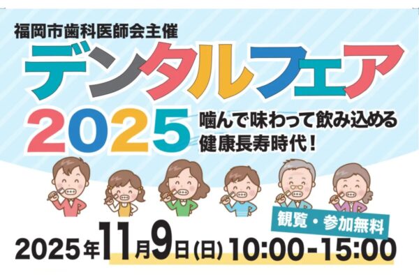 福岡市歯科医師会主催の「デンタルフェア2025」が、2025年11月9日(日曜)にららぽーと福岡で開催されます。歯の健康や「噛むこと」の大切さを、子どもから大人まで無料で楽しく学べる人気の啓発イベントです。
