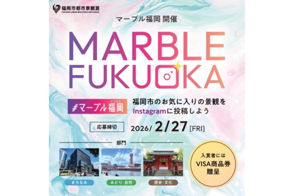 - 応募方法:福岡市都市景観賞の公式インスタグラム(@fukuokashi_toshikeikansyou)をフォローし、「#マーブル福岡」のハッシュタグを付けて写真を投稿してください。