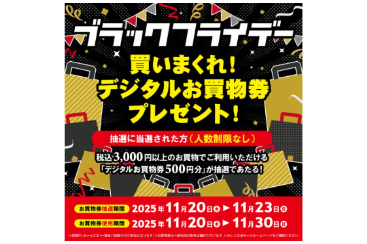 モール来館者限定で、税込3,000円以上の買い物に使える「500円分のデジタルお買物券」が当たる抽選も実施されます。