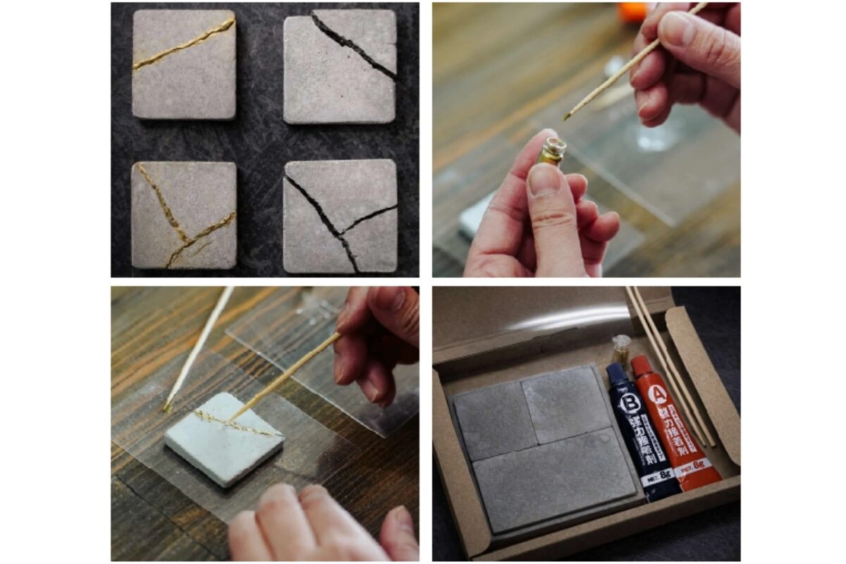 福岡市早良区の株式会社Bloficによるユニークな体験企画。あらかじめ継いだコンクリートのかけらに真鍮粉を施し、短時間で金継ぎ体験ができます。