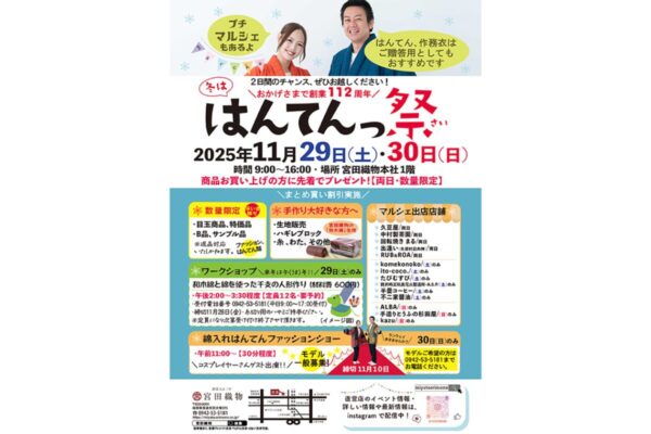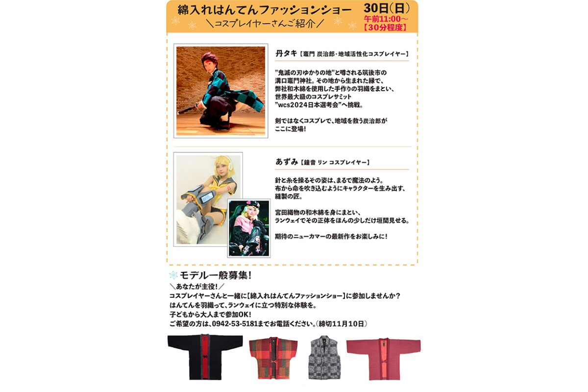 福岡県筑後市の老舗織物メーカー「宮田織物」が、創業112周年・はんてん製造60周年を記念して「はんてんっ祭(さい)」を2025年11月29日(土)・30日(日)に開催します。ここでしか手に入らない限定商品や、人気コスプレイヤーも登場するファッションショー、干支人形づくり体験など、世代を超えて楽しめる催しが満載です。