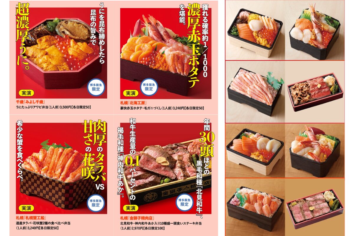 生産数がごくわずかな北海道産黒毛和牛「北見和牛」や「神内和牛あか」を贅沢に使った肉弁当も登場。希少な蟹の競演も見逃せません。