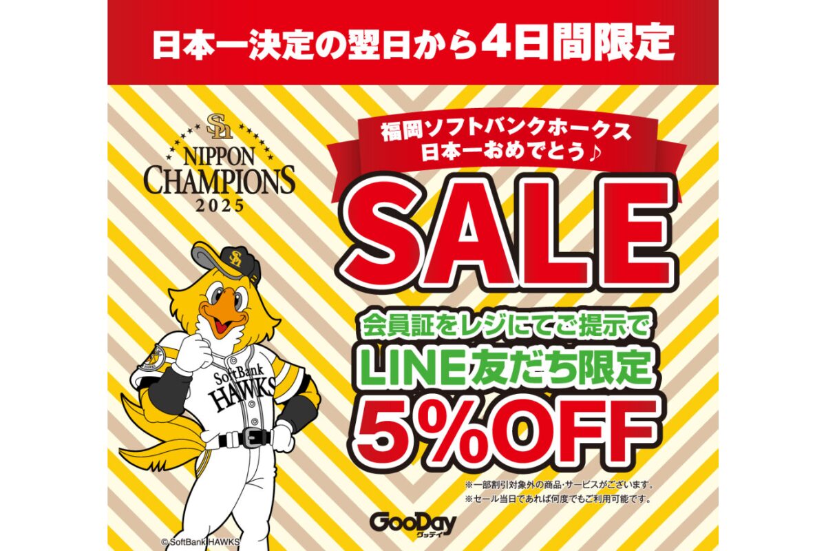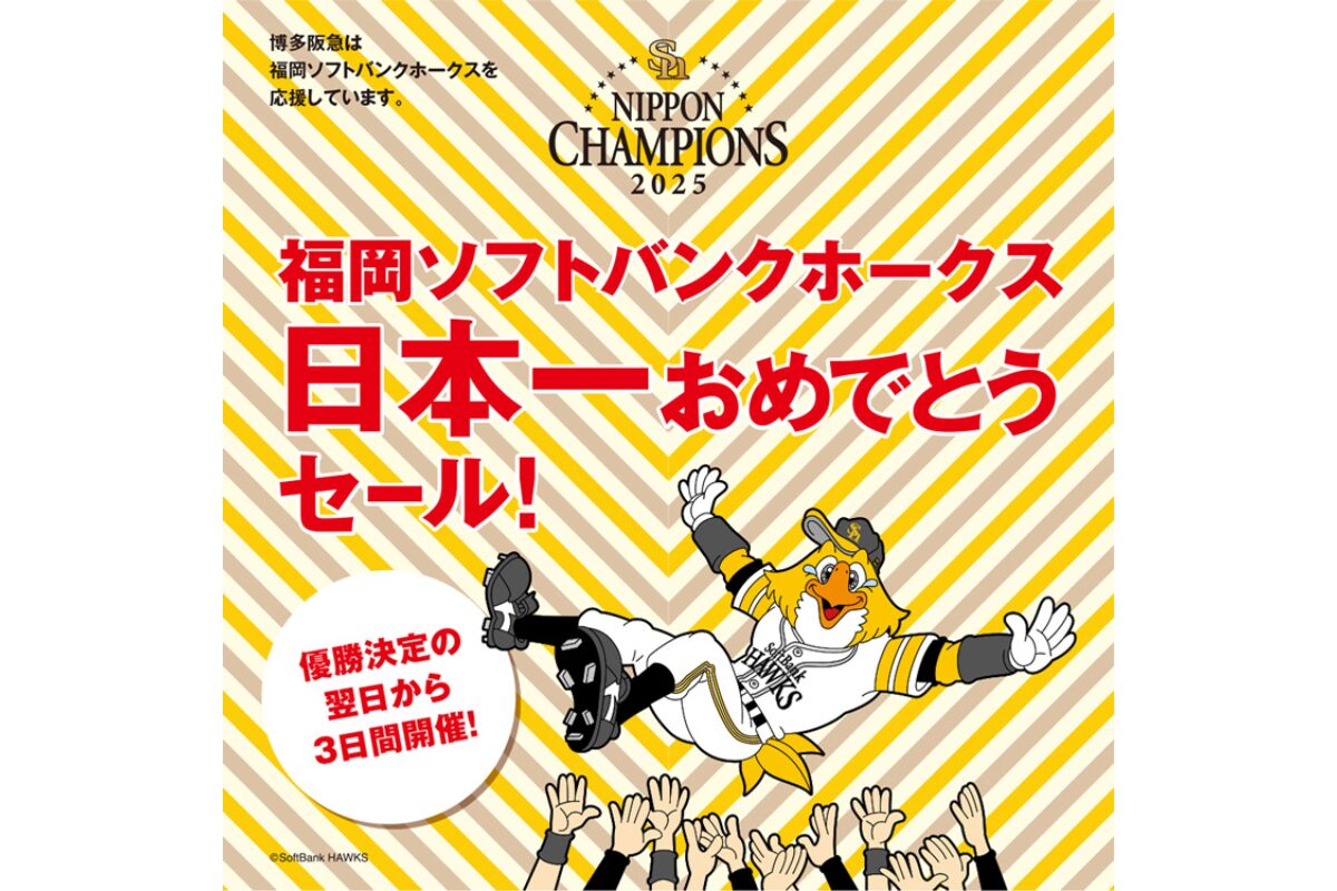 福岡ソフトバンクホークスの日本一を記念した優勝セールが、福岡市内を中心に2025年10月31日(金)より各地でスタートします。
