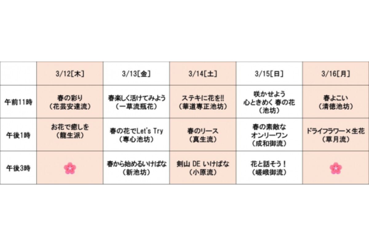 3月13日(金)はいけばな入替えのため午後4時閉場、最終日3月16日(月)は午後5時閉場となります。