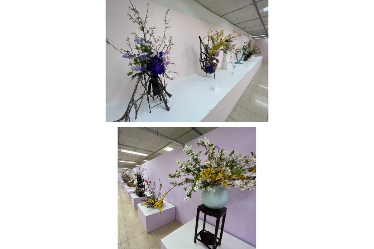 色とりどりの春の花々が織りなす空間は、会場に一歩足を踏み入れた瞬間から心をやさしく包み込みます。西日本華道連盟13流派が集う圧巻の作品群に加え、韓国コッコジ協会の特別出品や子どもたちのいけばな作品など、多彩な表現に出会えるのも本展ならではの魅力です。