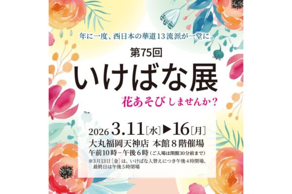 春の訪れを告げる恒例イベント「第75回 いけばな展」が、博多大丸で開催されます。西日本華道連盟13流派が一堂に会し、みずみずしい春の花々で会場を彩ります。毎年大好評の「いけばな」体験会も開催!いけばなに親しんできた方はもちろん、初めての方も楽しめる内容です。