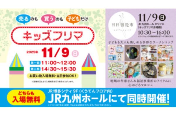 子どもだけで売り買いを楽しむ「キッズフリマ」と、大人も楽しめるマルシェ「日日彼是市」が11月9日(日)、JR九州ホールで同時開催されます!学びと楽しさが詰まった1日限りのイベントをお見逃しなく!