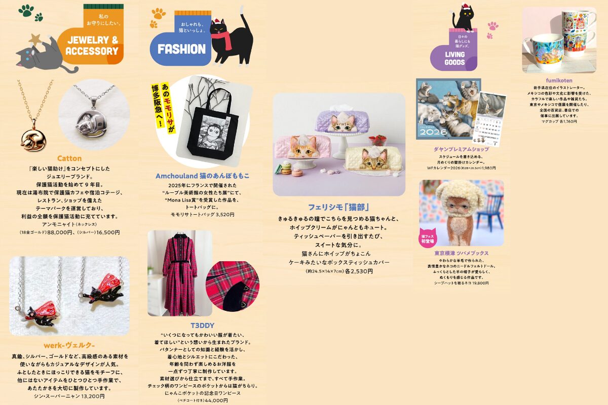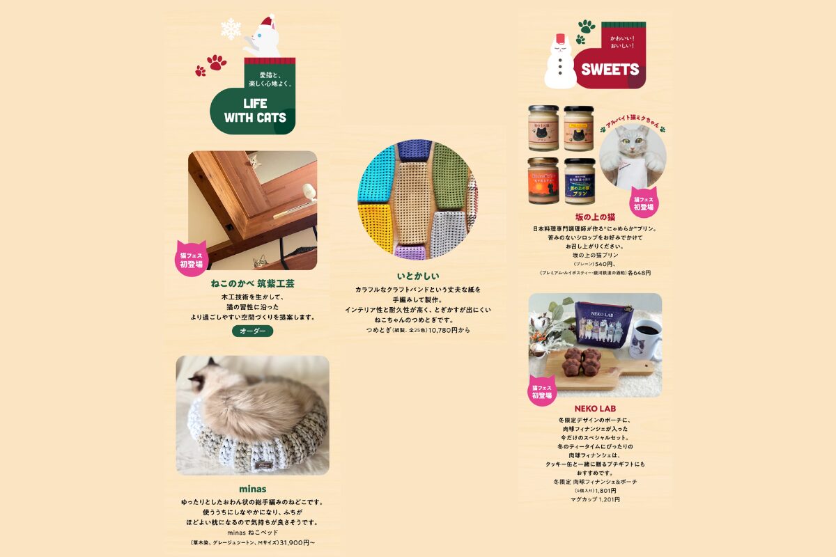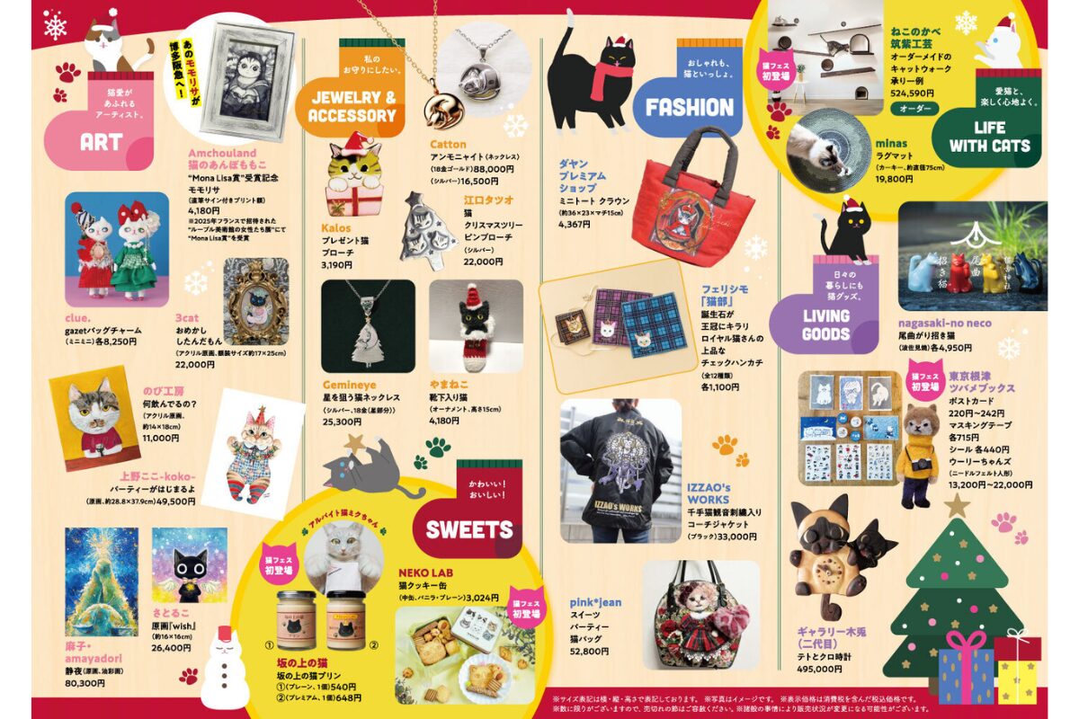 会場では、猫モチーフの限定アクセサリーやクリスマス仕様の雑貨、愛猫との暮らしを彩るインテリア小物など、ここでしか手に入らない猫アイテムがずらり。贈り物にもぴったりなラインアップがそろいます。