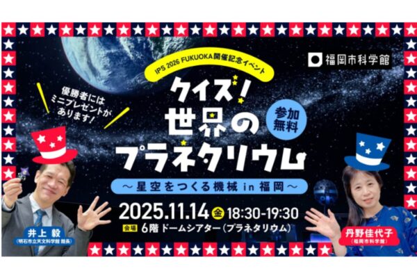2026年に福岡で開催される「国際プラネタリウム協会(IPS)」大会を記念したイベントが、2025年11月14日(金)に福岡市科学館で開催されます。プラネタリウムの歴史をクイズ形式で学べる貴重な機会です。