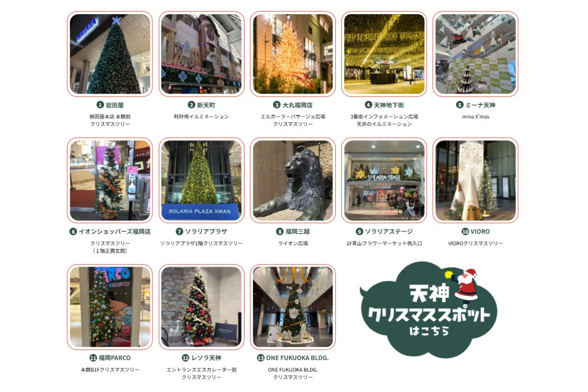 天神の13施設が連携して行うこのキャンペーンは、イルミネーションやクリスマスツリーが設置されたスポットを訪れ、写真を撮って応募するだけで、抽選で130名に2,000円分の「Tenjinハッピーチケット」が当たります。